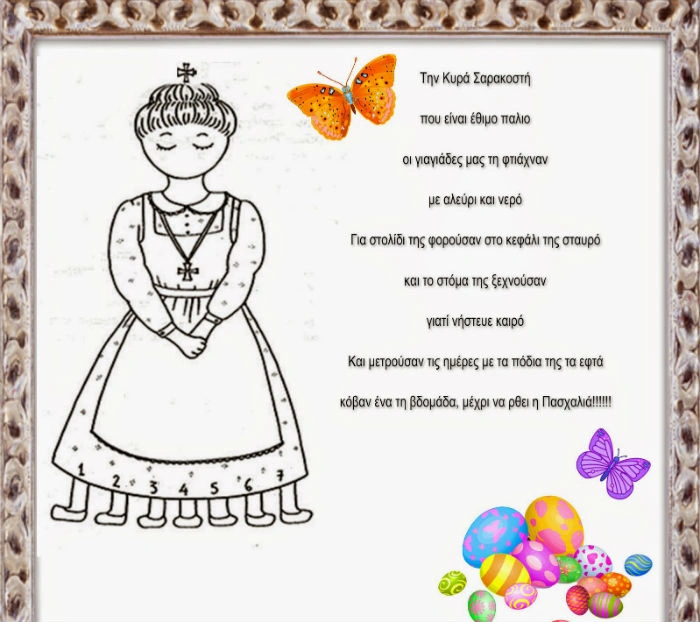 Για το έθιμο της κυρα-Σαρακοστής έχουν γραφτεί οι παρακάτω στίχοι: