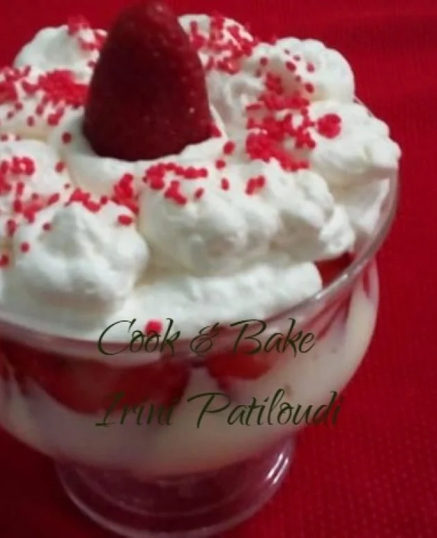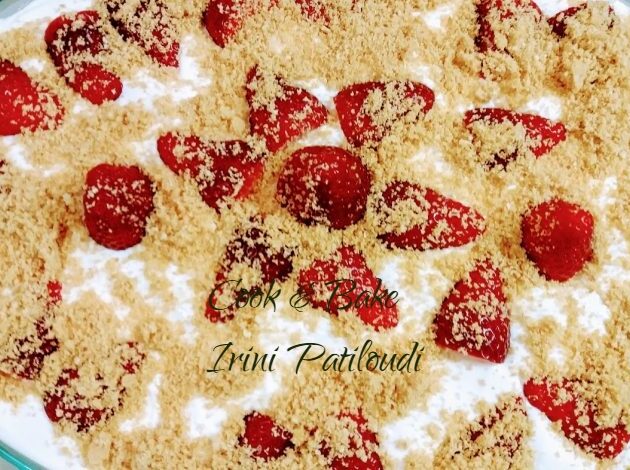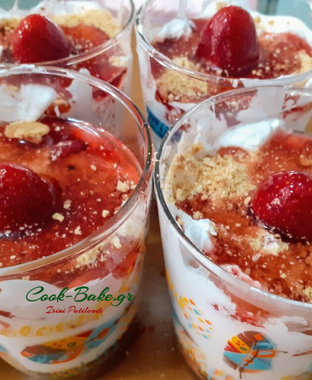 Φράουλες στο ποτήρι με κρέμα και μπισκότα