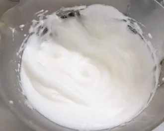 Χτυπάμε τα ασπράδια σε μαρέγκα και προσθέτουμε σιγά σιγά την κοσκινισμένη άχνη και την βανίλια, κρατάμε από αυτοό 4 κουταλιές της σούπας για το γλάσο που θα βάλουμε μετά το ψήσιμο.