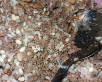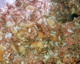Βάζουμε τώρα τα κουκουνάρια, κάστανα, βερίκοκα, δαμάσκηνα και το ρύζι και βράζουμε ακόμα 15 λεπτά μέχρι να βράσει το ρύζι. Αν χρειαστεί προσθέτουμε λίγο νερό ακόμα. Αν θέλουμε να την κάνουμε για να γεμίσουμε κοτόπουλο η γαλοπούλα μπορούμε να προσθέσουμε και τα εντόσθια τους στο τσιγάρισμα. Επίσης δεν θα βράσουμε το ρύζι τόσο πολύ αλλά 5 λεπτά μόνο γιατί θα ψηθεί και μέσα στο πουλερικό. Αφήνουμε να τραβήξει τουλάχιστον 15 λεπτά πριν να σερβίρουμε.