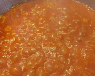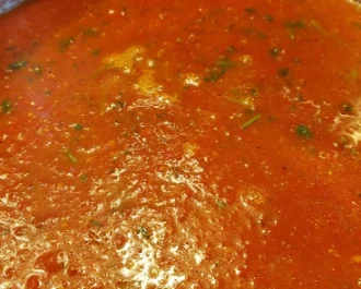 Τσιγαρίζουμε το κρεμμύδι το σκόρδο και την πιπεριά στο ελαιόλαδο να πάρουν ελαφρύ χρώμα και προσθέτουμε τις τριμμένες ντομάτες, τα μπαχαρικά , τον μαϊντανό και αφήνουμε να βράσουν για 15 λεπτά περίπου.