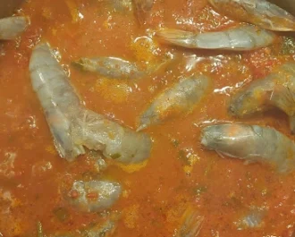 Προσθέτουμε τις γαρίδες και βράζουμε άλλα 15 λεπτά σε μέτρια φωτιά,