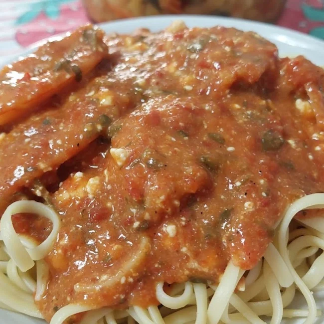 Υπέροχη γαριδομακαρονάδα με φρέσκες γαρίδες, φρέσκια ντομάτα, πιπεριά, φέτα.