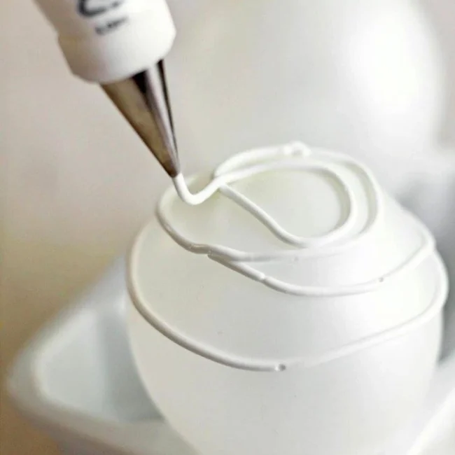 Βάζουμε σε σακούλες κορνέ μιάς χρήσης με λεπτή μύτη και γράφουμε ή κάνουμε σχέδια επάνω σε μπισκότα.