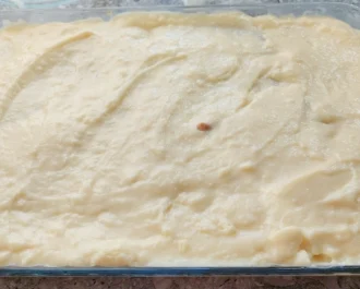 Αφού τράβηξε το σιρόπι το τσουρέκι και κρύωσε η κρέμα την απλώνουμε από πάνω ομοιόμορφα.