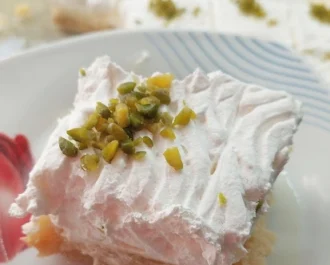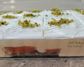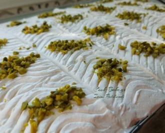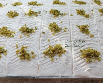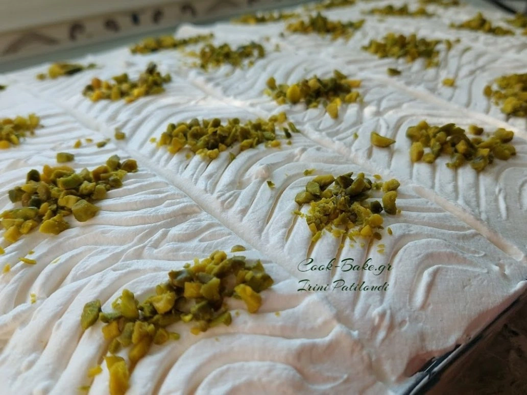 Κάνουμε γραμμές με ένα πιρούνι ή με σακκούλα κορνέ κάνουμε ροζέτες και πασπαλίζουμε με φυστίκι σπασμένο.