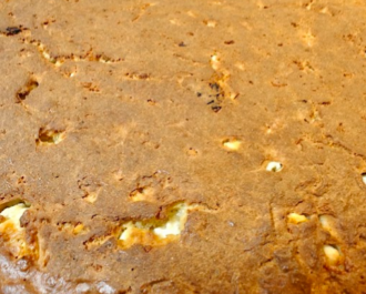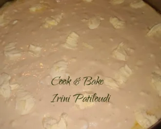 Αδειάζουμε την ζύμη στο ταψί αφού έχει καεί ελαφρώς το λάδι, κόβουμε νιφάδες από βούτυρο τις βάζουμε από πάνω.