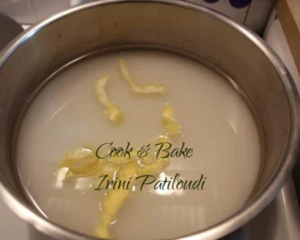 Σε βαθιά κατσαρόλα ρίχνουμε 500 γρ. νερό και προσθέτουμε τη ζάχαρη, τη φλούδα λεμονιού και τα αφήνουμε να βράσουν καλά μέχρι σχεδόν να δέσει σε σιρόπι.