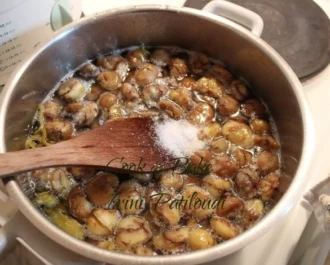 Στη συνέχεια ρίχνουμε τα κάστανα και το ξινό και τα αφήνουμε να βράσουν για 1 λεπτό. Τα σβήνουμε και τα αφήνουμε να κρυώσουν.