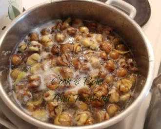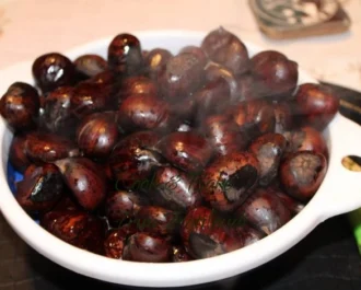 Πλένουμε τα κάστανα και τα βράζουμε με το νερό και το αλάτι για 30 λεπτά και τα σουρώνουμε.