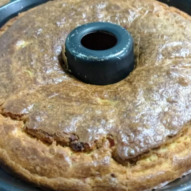 Ψήνουμε στους 180 βαθμούς σε βουτυρωμένη φόρμα του κείκ για 1 ώρα. Βγάζουμε από την φόρμα αφού έχει σχεδόν κρυώσει γιατί ζεστό θα μας διαλυθεί.