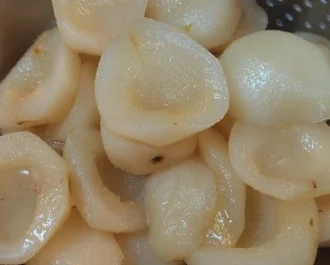 Προσθέτουμε τα αχλάδια καθαρισμένα και κομμένα στην μέση και βράζουμε και αυτά μαζί για άλλα 15 λεπτά.