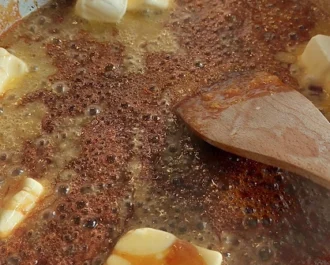 Μόλις καραμελώσει και πάρει χρώμα αποσύρουμε από την φωτιά και ρίχνουμε μέσα το βούτυρο σε κύβους και την κανέλα.