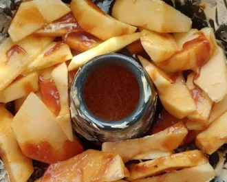 Αδειάζουμε την καραμέλα σε ίσα μέρη στις φόρμες πάνω από τα μήλα και ανακατεύουμε λίγο να πάει σε όλα τα μήλα.