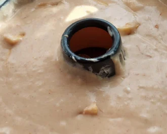 Όσο είναι ακόμη ζεστό το αναποδογυρίζουμε σε πιατέλα στρόγγυλη.