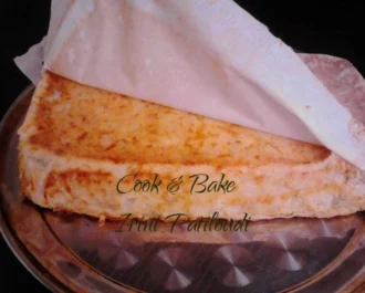 Αφήνουμε να κρυώσει. Αναποδογυρίζουμε σε μια πιατέλα και βγάζουμε την λαδόκολλα.