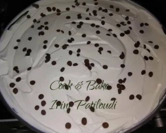 Χτυπάμε την σαντιγί και την απλώνουμε από πάνω, στολίζουμε με σταγόνες σοκολάτας και βάζουμε στο ψυγείο.