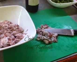 Ψιλοκόβουμε τα πλοκάμια από τα καλαμαράκια. Τσιγαρίζουμε τα κρεμμυδάκια, τα πράσα, το σκόρδο και τα πλοκάμια.