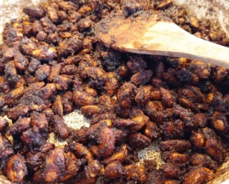 Ανακατεύουμε να μην κολλήσουν μέχρι να μείνουν τα αμύγδαλα μόνο με την ζάχαρη κολλημένη επάνω τους.