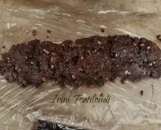 Πιέζουμε έπειτα το μείγμα ώσπου να σφίξει το τοποθετούμε σε μεμβράνη. Με τα χέρια μας του δίνουμε σχήμα σαν σαλάμι και το τυλίγουμε στη μεμβράνη, σφιχτά. Το αφήνουμε 2 - 3 ώρες στο ψυγείο.