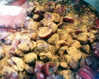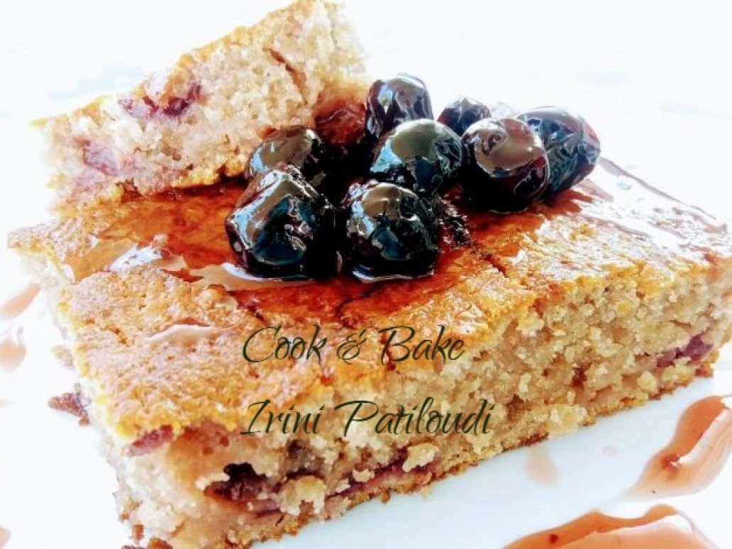 Καλό είναι να βάλουμε την ζύμη σε μεγάλο ταψί (όχι σε φόρμα του κέικ) για να μπορέσει να ψηθεί ομοιόμορφα γιατί δεν θα φουσκώσει πολύ λόγω κερασιών. Ψήνουμε στους 180 βαθμούς για 50 λεπτά. Δοκιμάζουμε με μυτερό μαχαίρι να δούμε αν ψήθηκε.