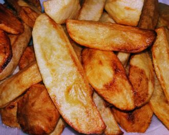 Τηγανίζουμε σε άλλο ηλιέλαιο τις πατάτες μας, χοντροκομμένες μαμαδίστικες.