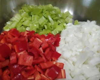 Τσιγαρίζουμε σε λίγο ελαιόλαδο το κρεμμύδι με τις πιπεριές.