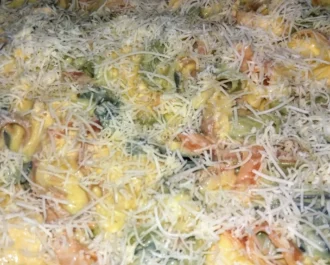 Ανακατεύουμε όλα μαζί με την ψευτομπεσαμέλ και πασπαλίζουμε από πάνω κίτρινο τυρί.