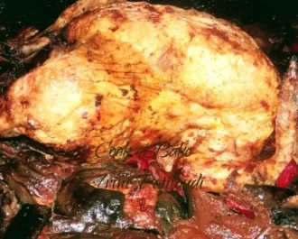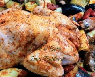 Βάζουμε στο ταψί μας όλα τα υλικά αφού τα έχουμε πλύνει και κόψει συν το ολόκληρο κοτόπουλο. Αν θέλουμε το κόβουμε και σε μερίδες.