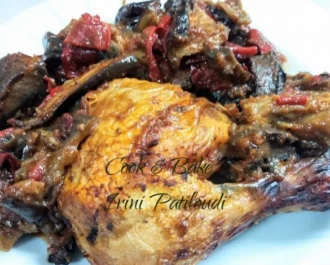 Κοτόπουλο με μελιτζάνες, πιπεριές και μανιτάρια.