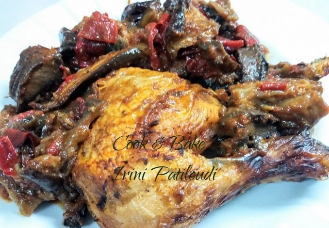 Κοτόπουλο με μελιτζάνες, πιπεριές και μανιτάρια