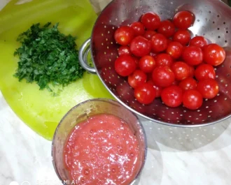 Μόλις αλλάξει χρώμα το κοτόπουλο, προσθέτουμε την ώριμη ντοματα και τα ντοματίνια, αλάτι, πιπέρι και τα αφήνουμε να σιγοβράσουν για 10'. Τέλος, προσθέτουμε ψιλοκομμένο μαϊντανό. ανακατεύουμε και σβήνουμε.