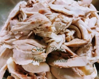 Το βγάζουμε με τρυπητή κουτάλα και το αφήνουμε λίγο να κρυώσει και το ξεκοκκαλίζουμε με το χέρι και το αφήνουμε σε σκεπασμένο δοχείο.