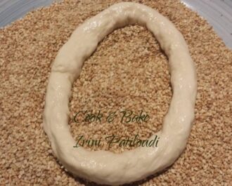 • Βουτάμε στο ζαχαρόνερο και μετά στο σουσάμι, αφήνουμε σε αντικολλητικό χαρτί σε ταψί άλλα 10 λεπτά .