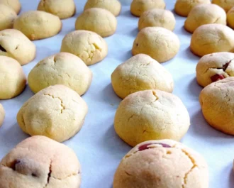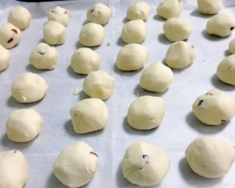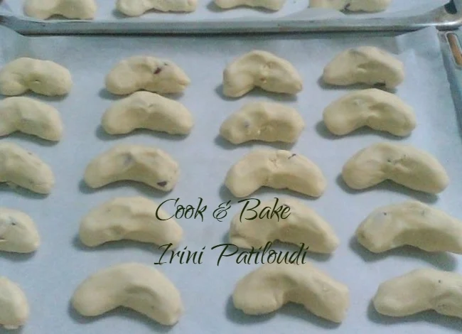 Πλάθουμε σε μακρόστενο φεγγαράκι ή στρόγγυλο σχήμα. Αραδιάζουμε σε ταψί με χαρτί ψησίματος.