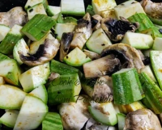 Κόβουμε τα καθαρισμένα λαχανικά μας σε κύβους τα κολοκυθάκια, σε φέτες χοντρές τα μανιτάρια και τα τοποθετούμε σε μία μικρή γάστρα με καπάκι. Προσθέτουμε τα μπαχαρικά μας το λάδι και το νερό.