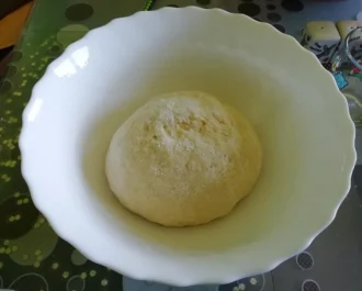 Σε ένα ταψί στρόγγυλο ρίχνουμε αυτό το μείγμα. Στην άκρη, βάζουμε 7γρ αλάτι και 25 γρ ζάχαρη. Στη μέση, βάζουμε 20 γρ φρέσκια μαγιά, 220 ml κρύο γάλα και 70 γρ αβγό χτυπημένο. Σιγά σιγά, ανακατεύουμε με το αλεύρι αφήνοντας το αλάτι και τη ζάχαρη στο τέλος και ζυμώνουμε.