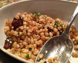 Πλένουμε το σιτάρι από το προηγούμενο βράδυ και το βάζουμε να μουλιάσει με κρύο νερό και λίγο αλάτι σε μία κατσαρόλα. Το πρωί το ξεπλένουμε να φύγει η μαυρίλα του και το βράζουμε καλά για 40 λεπτά. Το στραγγίζουμε καλά στο σουρωτήρι και φυλάμε σε μπολ τον χυλό του. Το απλώνουμε σε πετσέτα και το αφήνουμε να στεγνώσει και όχι να ξεραθεί. Ξεπλένουμε τις σταφίδες και τις βουτάμε για 3 λεπτά σε ζεστό νερό για να μαλακώσουν. Τις σουρώνουμε και τις στεγνώνουμε σε πετσέτα.