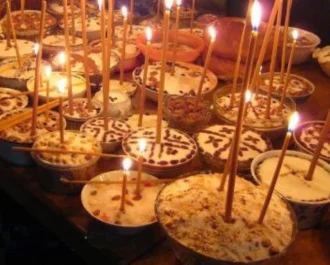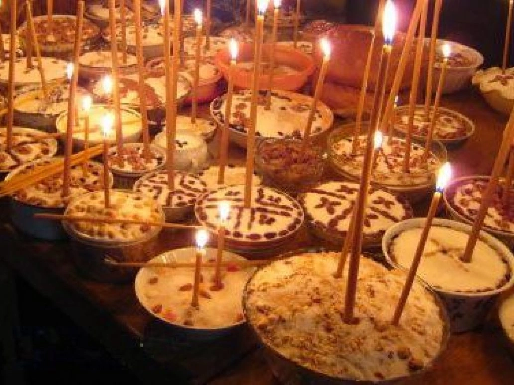 Στην συνέχεια, αδειάζουμε το στεγνωμένο σιτάρι και τις στεγνωμένες σταφίδες σε βαθιά λεκάνη και προσθέτουμε ένα-ένα τα υλικά μας, εκτός από την φρυγανιά και την ζάχαρη. Ανακατεύουμε με τις παλάμες το ινδοκάρυδο με το ξύσμα για να μη λασπώσει το ξύσμα και να απλωθεί ομοιόμορφα στο υλικό. Ζάχαρη στην γέμιση του κόλυβου δεν βάζουμε. Παίρνουμε ένα δίσκο και στρώνουμε στη βάση του μία λαδόκολλα, την οποία κόβουμε με το ψαλίδι στο σχήμα της βάσεως. Απλώνουμε το υλικό έτσι ώστε να σχηματισθεί ένα βουναλάκι χωρίς να είναι μυτερό και το συμπιέζουμε προς τα κάτω με τις δύο παλάμες.