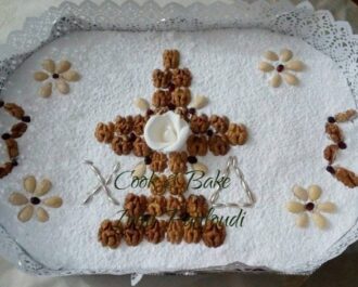 Ξεκινάμε το στόλισμα. Βρίσκουμε το κέντρο του δίσκου και σχηματίζουμε αν θέλουμε ένα σταυρό με υλικά της αρεσκείας μας. Τα ασημένια κουφετάκια τα βρίσκουμε σε κατάστημα ξηρών καρπών συνήθως ή σε καφεκοπτεία που έχουν και ζαχαρωτά, καραμέλες κλπ.