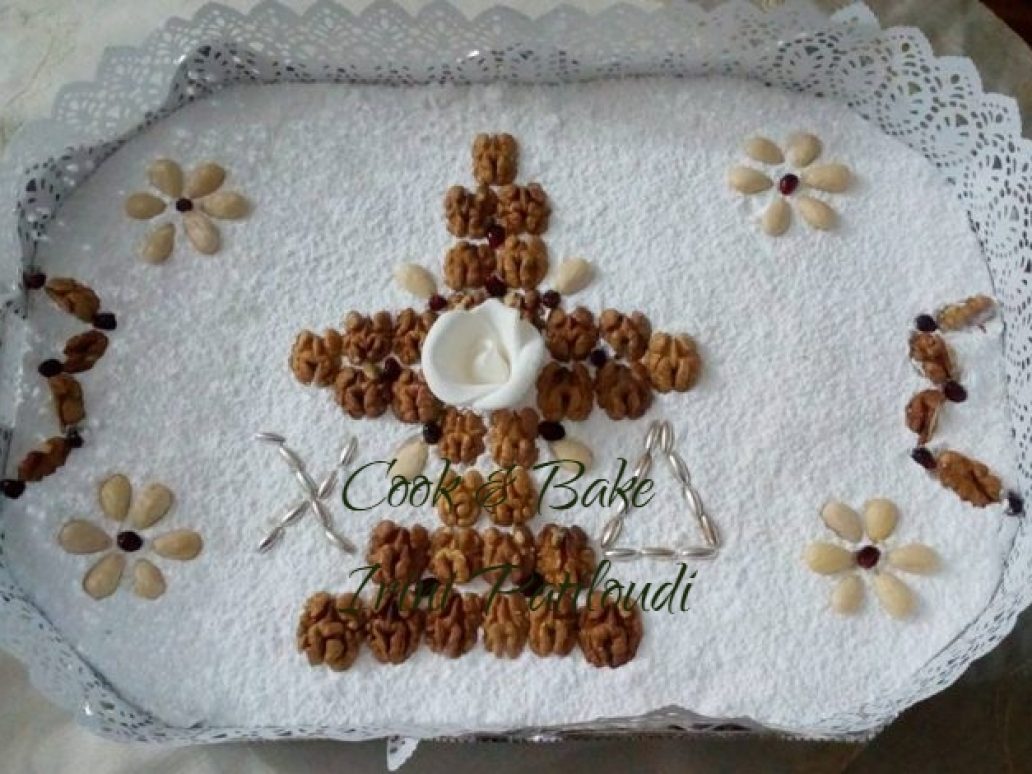 Σε μία λεκάνη ανακατεύουμε πολύ καλά όλα τα υλικά μας. Τα στρώνουμε σε δίσκο και τα πατάμε με τη παλάμη να καθίσει το μείγμα. Ρίχνουμε μια στρώση φρυγανιά και ξαναπατάμε με χαρτοπετσέτα. Ρίχνουμε μια στρώση κρυσταλλική ζάχαρη, ξαναπατάμε με χαρτοπετσέτα. Με ένα σουρωτήρι ψιλό πασπαλίζουμε ζάχαρη άχνη αρκετή από πάνω.