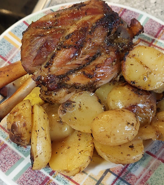 Συνοδευόμενο εδώ με πατάτες φούρνου, ωραίο μελωμένο το κότσι και πολύ νόστιμο και μαλακό.