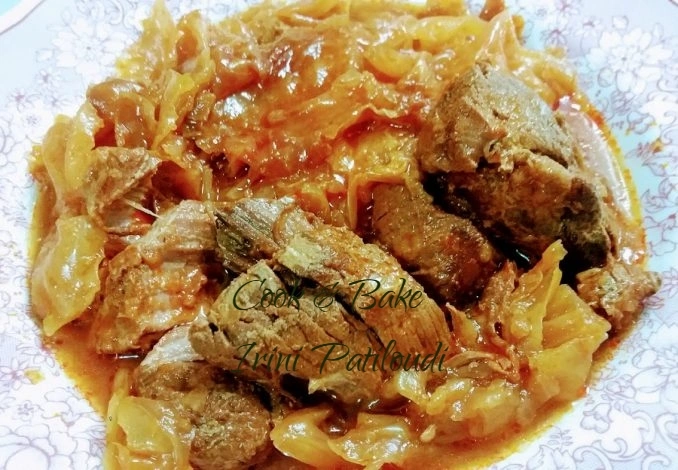 Έχουμε κόψει χοντρά το λάχανο μας και το προσθέτουμε στο ζουμί από το κρέας. Βράζουμε σε χύτρα για 10 λεπτά ή σε κατσαρόλα για 20 λεπτά. Ίσως χρειαστεί λίγο νεράκι ίσως και όχι. θέλουμε να μην είναι πολύ ζουμερό.