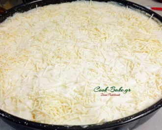 Έχουμε κρατήσει περίπου 1/4 από την μπεσαμέλ μας και την αδειάζουμε στα τελευταία φύλλα να τα καλύψει καλά. Πασπαλίζουμε με κεφαλοτύρι τριμμένο.
