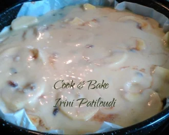 Για την ζύμη…. Χτυπάμε 200γρ μαργαρίνη η βούτυρο πολύ μαλακό, 150γρ ζάχαρη, ξύσμα και χυμό από 1 λεμόνι, 2 βανίλιες, 1/2 ποτήρι γάλα, 4 αυγά, και στο τέλος το μπείκιν, αλεύρι 400 με 500γρ να γίνει μια ζύμη του κέικ όχι πολύ σφιχτή. Αδειάζουμε επάνω από τα ζεστά μήλα.