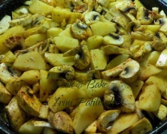 Κόβουμε τα μανιτάρια μας σε φέτες, τις πατάτες σε χοντρά κομμάτια, ρίχνουμε το λάδι μας , τα μπαχαρικά και το νερό.