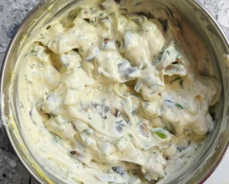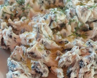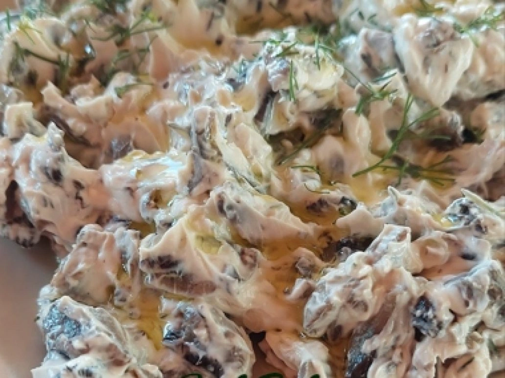 Με γιαούρτι, μαγιονέζα, μουστάρδα, θυμίζει λίγο ρωσική σαλάτα αλλά είναι μόνο με μανιτάρια ψητά.