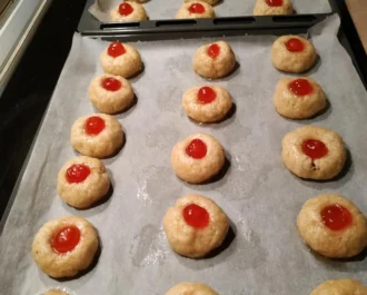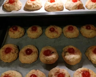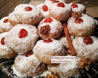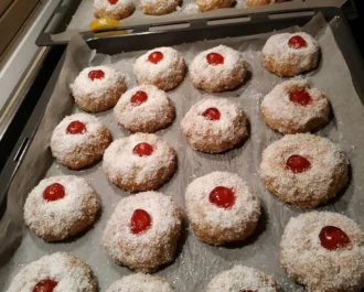 Ανακατεύουμε όλα τα υλικά για την ζύμη μαζί. Πλάθουμε μπαλάκια τα πατάμε λίγο να γίνουν πλατιά ,τοποθετούμε στο κέντρο καρύδι και το ξανακλείνουμε. Βάζουμε μισό κερασάκι από πάνω.