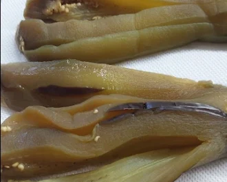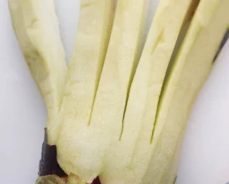 Τις κόβουμε στην μέση μακρόστενα και κόβουμε χοντρές λωρίδες αλλά όχι από τελείως επάνω.