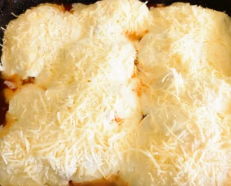Αν θέλουμε βάζουμε στην μπεσαμέλ και τυρί τριμμένο κίτρινο ή πασπαλίζουμε από πάνω πριν το ψήσιμο.